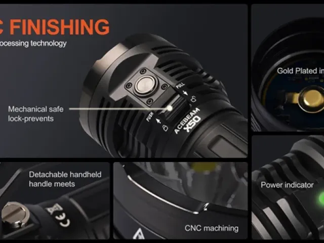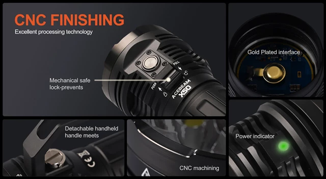 The Acebeam X50 2.0 PD Power Bank 6500k flashlight torch is a high-powered, durable flashlight that is perfect for outdoor activities such as camping and hiking. This flashlight is equipped with six Cree XHP70.2 LEDs that allow it to emit up to 45,000 lumens, making it one of the brightest flashlights on the market. The flashlight also has a beam distance of 871 metres in turbo mode, which means you can see things from far away.