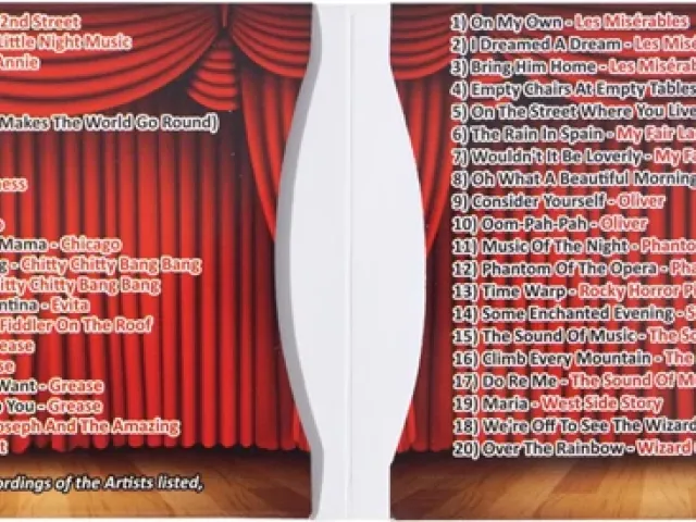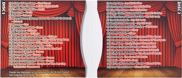 Featuring tracks like "Send In The Clowns" from A Little Night Music, "Tomorrow" and "It's A Hard Knock Life" from Annie, "Cabaret" and "Money Money (Money Makes The World Go Round)" from Cabaret, "Memory" from Cats, "All That Jazz" and "Razzle Dazzle" from Chicago, "Chitty Chitty Bang Bang" and "Truly Scrumptious" from Chitty Chitty Bang Bang!
