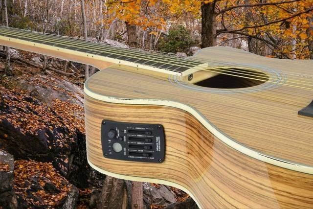 The electronics include a built-in tuner, a volume control, and sliders for bass, mid, treble, and presence, which provide a wide range of tonal possibilities. The piezo pickup accurately captures the natural sound of the guitar and delivers it to an amplifier or a PA system.
