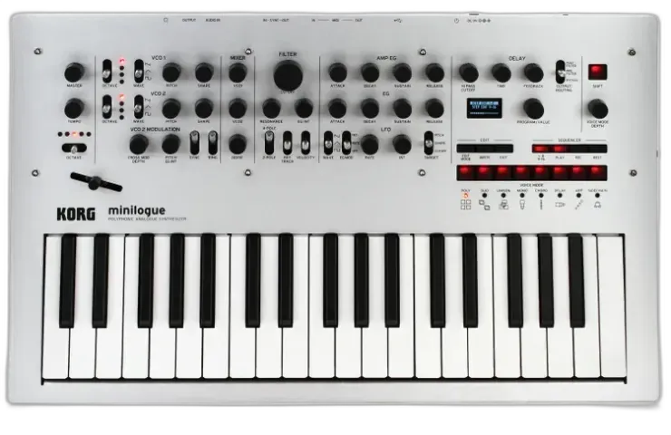 The Korg Minilogue inspires creativity with its intuitive features, including a polyphonic step and motion sequencer, a built-in tape-style delay, diverse sound shaping and filter options, and an oscilloscope display for visual feedback. Its newly developed analog synthesizer circuit delivers rich polyphony and complete control, allowing you to create expressive sounds with the depth and character that only real analog can provide.